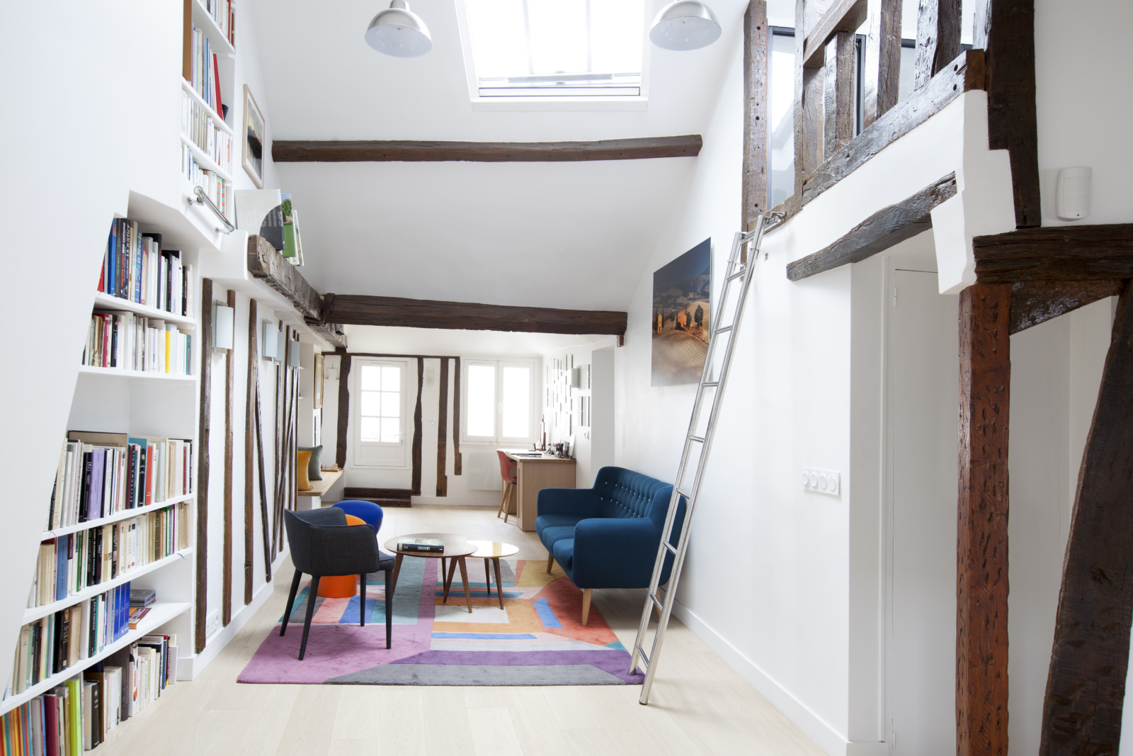Bertrand a revu la configuration de fond en comble et pour cause. Nous n’avions pas du tout la même occupation de l’appartement. Mon amie était en couple avec un enfant, moi je vis seul. Le plan de l’appartement a complètement évolué puisque la grande pièce était auparavant coupée en deux pour accueillir une chambre. Mais rien n’arrête un plaideur de son envergure : démolition, reconstruction, décoration, aux grands mots, les grands moyens : il a cassé une partie de la mezzanine, ajouté des poutres et des tomettes pour retrouver le cachet de l’ancien et ponctué le tout de touches de couleur pour apporter plus de peps.