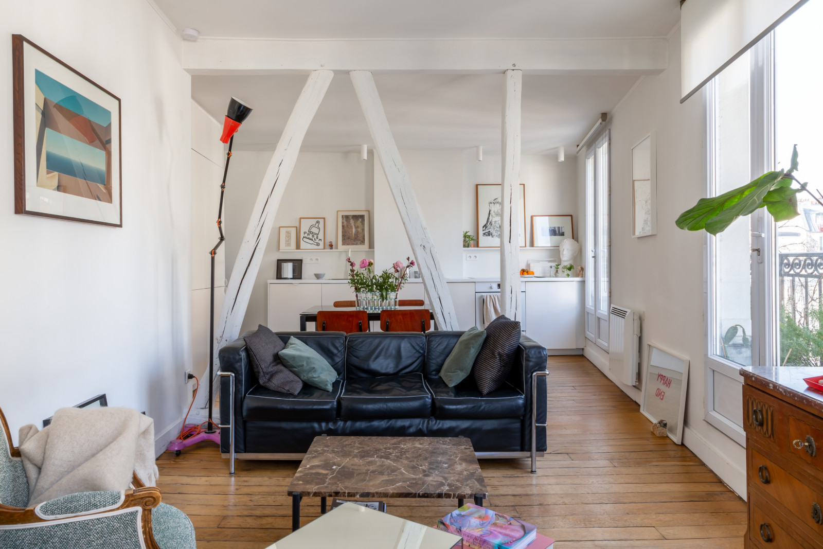 omplètement con". Et puis ils réfléchissent avec un ami architecte, de l'agence Bateaumagne. Leurs intuitions se rejoignent, ils s'accordent sur la même solution : une circulation par l’arrière. Pour séparer la chambre du séjour, créer une salle de bains sur cour et une chambre indépendante sur la rue. Dans le séjour, ils dégagent les poutres enserrées dans un bar et créent une grande pièce avec cuisine ouverte. C’est la bonne recette. Mathias et Geoffrey disent qu’ils ont acheté l’appartement pour lui-même plus que pour le quartier. Mais depuis 6 ans qu’ils l’occupent, tout a changé. Une vraie vie gastronomique s’est développée, les commerçants se parlent et il fait bon s’y promener. Il y avait déjà ça à Château d’eau, mais en presque trop touristique. Avec des "