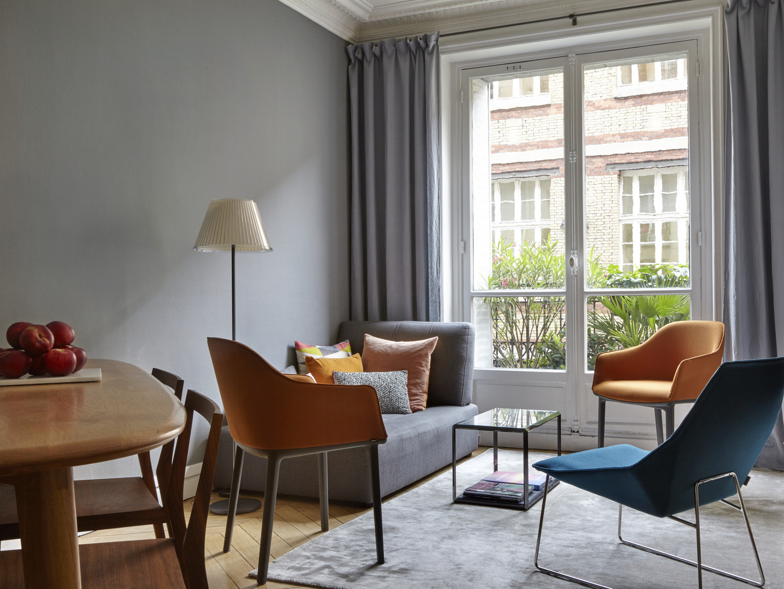 Pour commencer, un rideau ocre qui descend astucieusement du plafond pour cacher les détails moins glamours de l’appartement.