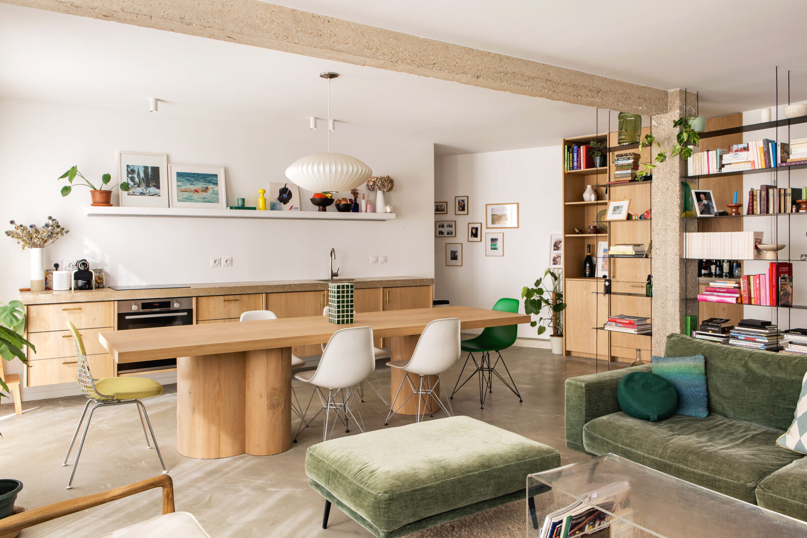 Affaire de circonstances autant que de passion : la transformation radicale de ce qui va devenir leur nouveau foyer sera confiée à l’architecte Jonathan Stene Burger, de l’agence Stene Alexopoulos Architecture. « On avait déjà rénové ensemble mon précédent appartement, c’est aussi un ami. J’aime beaucoup sa façon de travailler le béton et son sens du design », s’enthousiasme notre interlocutrice. Carte blanche lui sera donc donnée, « l’objectif premier étant d’optimiser au maximum cet espace compact pour accueillir une famille de quatre personnes », poursuit-elle.