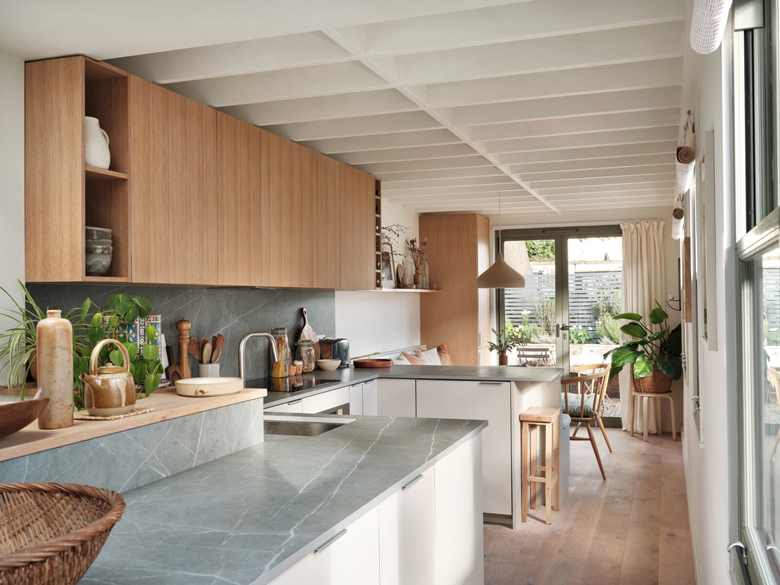 L’espace de vie du premier étage est accueillant et étonnamment ouvert. Les murs blanc cassé et le sol en chêne blanchi apportent chaleur et élégance à l’ensemble. La cuisine met en valeur le savoir-faire de HUSK [fabricant de façades permettant d’habiller des caissons Ikea ou Howdens, N.D.L.R.], avec sa crédence toute hauteur et son plan de travail en Neolith couleur ardoise, qui se prolonge pour créer un petit – mais ô combien accueillant – coin petit déjeuner.