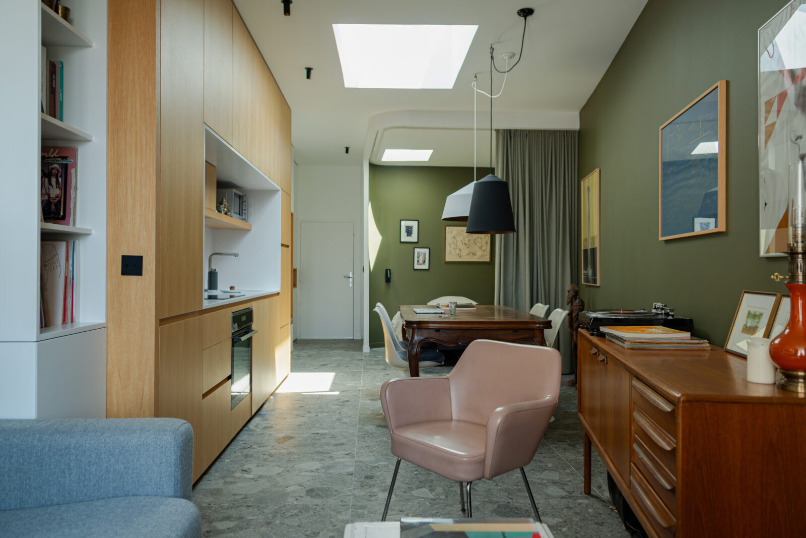 Olivier Rozé ne se laisse pas intimider par ces caractéristiques. Après s’être interrogé sur la nécessité d’entretenir un dialogue visuel avec l’extérieur depuis chacune des pièces du programme, l’architecte se lance dans la transformation de ce local brut en un logement fonctionnel. Pensé comme un véritable 3 pièces malgré sa superficie réduite, l’appartement, destiné à la fois à recevoir, travailler et vivre en famille, mise sur une décoration simple mais chaleureuse pour faire oublier les contraintes spatiales auxquelles l’architecte a dû faire face.