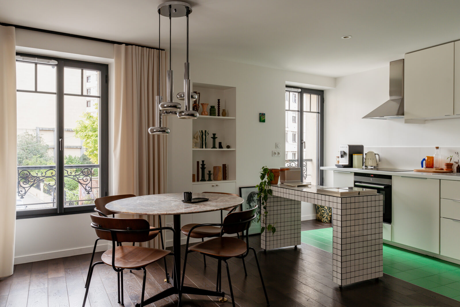 Initialement habillé de motifs ornementaux, le carrelage de la cuisine s’est vu unifié grâce à une peinture vert émeraude de chez Ressource. Une couleur qui, selon les propriétaires, dialogue à merveille avec le parquet en bois massif et le mobilier qui l’entoure.