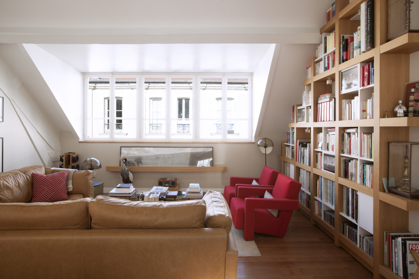 La grande bibliothèque du salon a été conçue par le designer Martial Marquet. Un design étudié pour s’intégrer parfaitement dans la sous-pente.