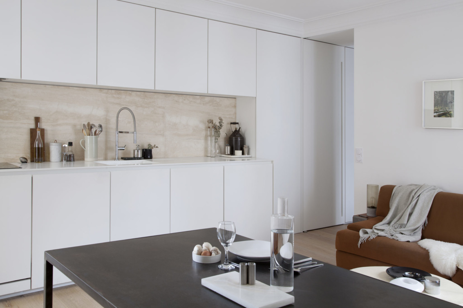 En installant la cuisine au cœur de la maison, Hugues souhaitait faire la part belle à sa passion pour la gastronomie. Mais pas question pour autant de polluer visuellement le salon-salle à manger avec des appareils électro-ménager disgracieux. Par un ingénieux système de placards dessinés sur mesure, ici, comme dans le reste de l’appartement, tout est là… mais rien ne se voit !
